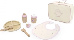The set includes everything young caregivers need: a plate, spoon, fork, pacifier, two bottles, and a soft bib. Thanks to safe workmanship, the toy is suitable for children aged 3+ and will become a favorite accessory for a play kitchen or doll corner.