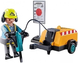 Head to the construction site with PLAYMOBIL ACTION HEROES – construction worker with jackhammer. The figure with a removable helmet and gloves can handle any road repair: a jackhammer connected to a compressor by a realistic silicone hose, a trailer with a tow hook for easy transport, and warning signage for safe work.