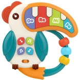 The Woopie pelican is an ideal first musical toy for little ones. Thanks to colorful keys with the tones “Do, Re, Mi, Fa,” children easily discover the world of music while sliding the beads and pressing the buttons to train fine motor skills and hand–eye coordination. The soft comb and arch with rings also function as a teether to relieve teething discomfort.