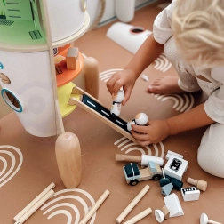 The toy is made primarily of wood, complemented by high-quality plastic, and finished with a non-toxic varnish. It is durable, beautifully made, and designed for long-term play in the kids’ room. It supports imagination, creativity, and fine motor skills.