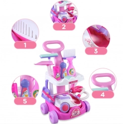 The set includes everything needed for imaginative play: from a trolley with handle and holders to brushes, mop, dustpans and “cleaning agents.” Safe design and low weight ensure comfortable use even for younger children.