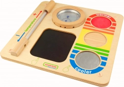 This robust wooden wall board offers children a safe way to learn the basics of working with temperature. Color-coded zones and the heat-reactive black surface let children see a handprint—the warmer the hand, the more pronounced the mark. Learning becomes playful and supports sensory development, cognitive skills, and understanding of real-life situations where something may be too hot or very cold.
