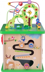 - 5 activities in 1 toy: bead maze, shape sorter, gear wheels, rotating elements, sliding animal maze