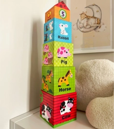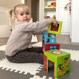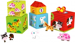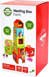 Discover fun and educational farm-themed stacking blocks from WOOPIE GREEN. Colorful illustrated boxes with windows and wooden animal figurines support fine motor skills, learning numbers, and animal recognition, including English names. Safe design made from quality materials and the option for building, inserting, and storing small items make this set an ideal toy from 12 months.