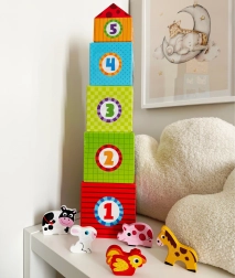 Numbered blocks with clear illustrations teach children to distinguish sizes, count, and get to know the English names of animals—naturally, during play.