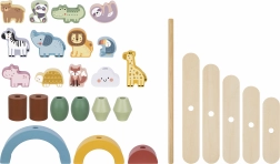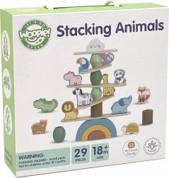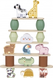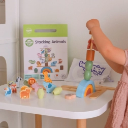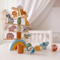 Wooden animals for stacking are the ideal toy for developing children's creativity. The set contains 12 cute wooden animals and 16 balancing elements, such as wooden rainbow, stones, platforms, and a cheerful cloud.
