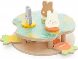 The toy includes three colorful bunnies that a child places into platforms according to shape and color. Pressing the carrot makes them pop out!