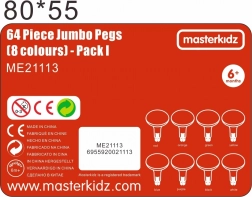 The set includes 64 jumbo pegs — 8 of each color. Ideal for learning colors, sorting, and creating bold patterns. Suitable for children from 6 months.