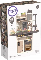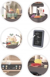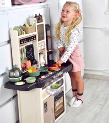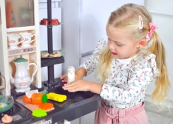 It also includes an egg boiler with LED light and sound, an opening oven and fridge, a chalkboard for the daily menu, a dish rack, and plenty of storage. The generous set of 65 accessories includes hook-and-loop fruit and vegetables, cookware, cutlery, and a tea set—everything kids need for imaginative play.