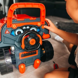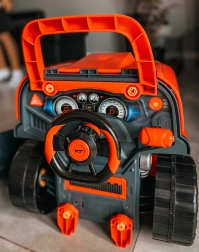 Discover WOOPIE’s interactive truck front with an opening hood, steering wheel and dashboard, offering kids dozens of mechanical activities. The storage compartment holds tools, screws, and parts for assembly and disassembly. Fun is boosted by a light and sound module (engine, horn) with remote control and a practical wheel jack. A great toy for little mechanics that develops fine motor skills, imagination, and technical abilities.