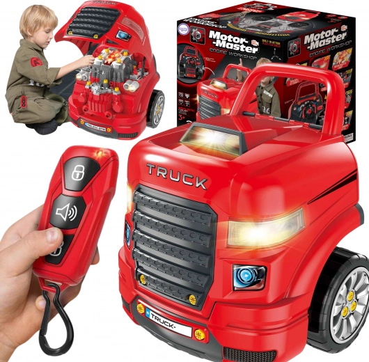 This workshop in the form of a truck cab brings kids realistic service-station experiences. Under the hood is a well-equipped “engine bay” with elements for assembly and disassembly, and the dashboard includes a steering wheel and controls. Lights and engine or horn sounds add authenticity – all operated with the included remote control.