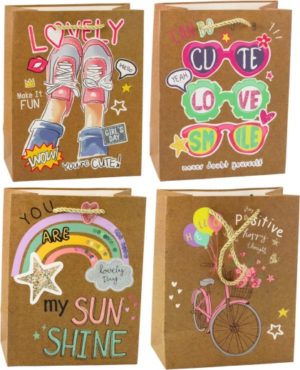 The bag features four different designs, each captivating with vibrant colors and positive slogans that highlight its youthful and optimistic character. Strong rope handles ensure comfortable carrying and are color-coordinated with the design. With dimensions of 23 x 18 x 10.5 cm, it's ideal for wrapping medium and smaller gifts such as cosmetics, accessories, books, or sweets.