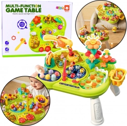 The table offers various functions that stimulate curiosity and support experimentation. It includes games like "catch the mole," interactive buttons, colorful flowers, rotary elements, levers, and gears. It helps children understand cause and effect, teaching precise finger and hand movements. It is thus not only a source of entertainment but also supports natural cognitive and manual development.