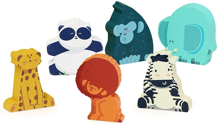 The wooden figures are sturdy, perfect for children's hands, and offer screen-free fun with an emphasis on independent exploration. The figures are stored in a beautiful wooden box with nature-themed designs and windows, bringing a touch of the wild right into the child's room. The set includes: 6 figures – lion, panda, gorilla, elephant, zebra, and panther.