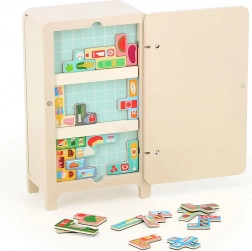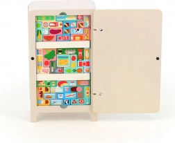The game design by Ingela P. Arrhenius includes a wooden fridge, two magnetic shelves, and 21 food magnets. Children can create their own fridge arrangements, which boosts their creativity and problem-solving ability. A brochure with directions offers 7 different solutions.