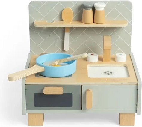 Its compact design in soft neutral colors is perfect for any child's room or playroom. It is made from FSC® certified wood and painted with non-toxic paints, ensuring sustainable and safe fun for children aged 3 and up. Besides fun, this kitchen supports development of imagination and creativity while children mimic kitchen roles.