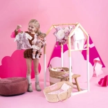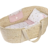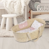 This beautiful Moses' basket is equipped with fabric pockets on both sides and includes a decorative duvet, pillow, and mattress. It is suitable for dolls sized 40-45 cm, but also serves well as storage space for other toys, such as plush animals.