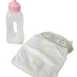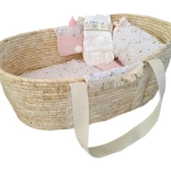The basket is hand-woven from dried corn leaves, making it an eco-friendly product. The package includes a play bottle fillable with water and a disposable diaper. Enjoy hours of fun with this lovely basket that is not only stylish but also practical.