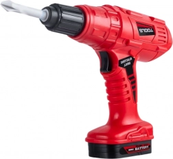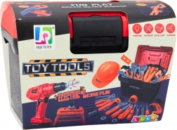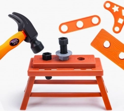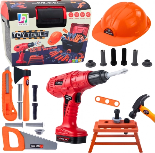Children's tool set allows young DIY enthusiasts to safely play with tools that look like real ones. The battery-powered electric drill has interchangeable attachments – flat, cross, and drill bit. Additionally, the set includes a workbench and a protective helmet for even more realism during play.