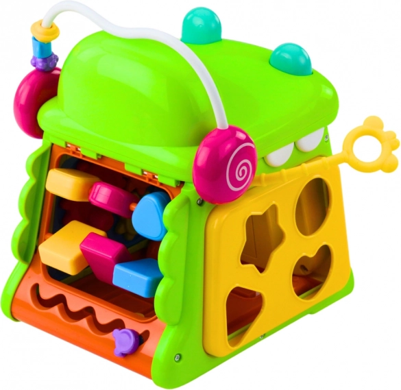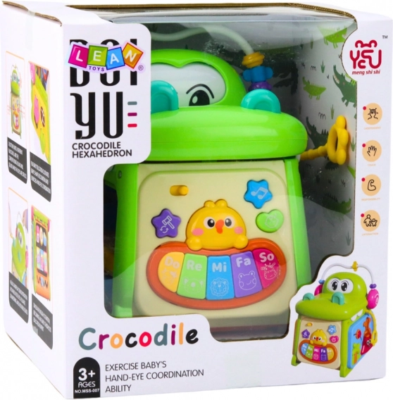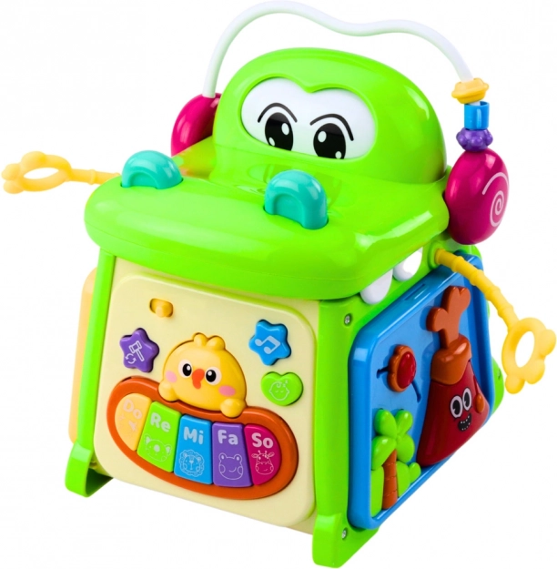 The interactive crocodile cube is equipped with a piano with color keys 'Do, Re, Mi, Fa, So', movable components for manipulation, and a clock with movable hands. Each side of the cube offers different activities, which keeps the child's interest for a longer time. Thanks to its rounded edges and large components, the toy is safe and supports the development of manual skills.