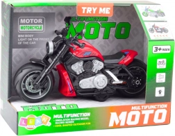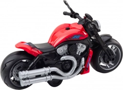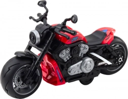 The motorcycle is designed in an intense red color and made from high-quality plastic resistant to everyday use. It features wide wheels, a sturdy body, and ergonomic handles, ensuring stability and comfort during play. Its appearance is inspired by classic single-track vehicles, adding authenticity to it.