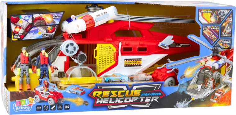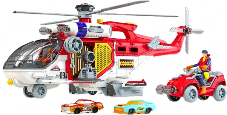 The helicopter is equipped with an opening fuselage, lights, and rescue sounds, as well as a cable rescue unit with a basket for lifting injured individuals in difficult terrain. Thanks to the water tank, which serves as a firefighting device, you can simulate extinguishing fires, and a special ramp allows small rescue vehicles to drive directly onto the helicopter's deck.
