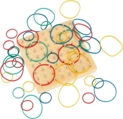 A smoothly sanded wooden board without sharp edges and pegs with rounded tips ensure safe play and prevent rubber bands from slipping off.