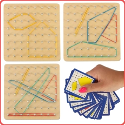 Discover a fun way to introduce children to the basics of math—shapes, angles, and symmetry. On the wooden board with a dense grid of pegs, children stretch rubber bands in various lengths and colors to create figures based on the cards or their own imagination. The activity strengthens hand–eye coordination, focus, and logical thinking.