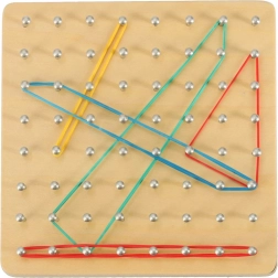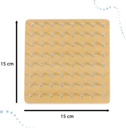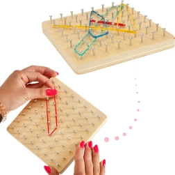 The board is made of smoothly sanded wood with no sharp edges. The metal pegs have rounded tips that protect against scratches and help keep the rubber bands in place. Thanks to its compact size, the geoboard is great at home and on the go.