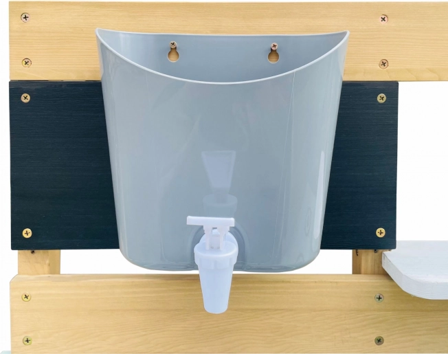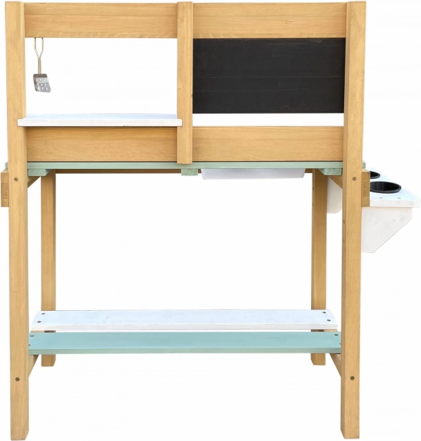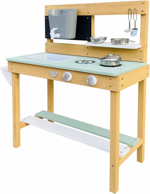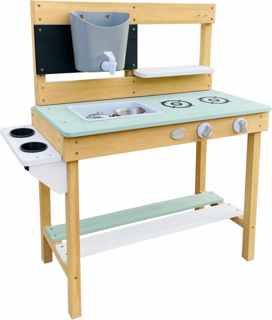 The wood from which the kitchen is made is treated with an eco-friendly coating, is child-safe, and meets CE and EN 71 standards. It is made from 100% FSC-certified Hemlock wood, resistant to weather and decay.