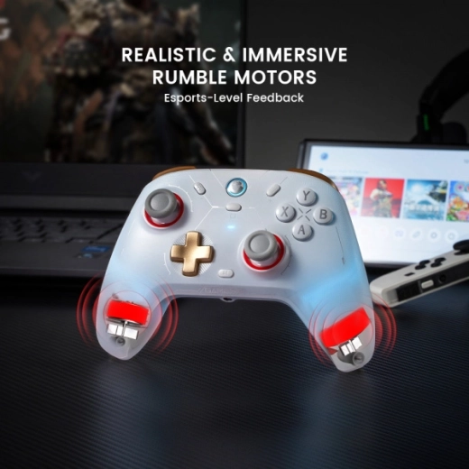 Thanks to three-mode connectivity (2.4 GHz, Bluetooth, wired), you can easily choose the ideal way to play with minimal latency. The 6-axis gyroscope supports motion control on SWITCH, asymmetric vibration motors provide realistic feedback, and esports-grade front buttons with microswitches ensure fast and confident presses. Customizable RGB effects and quick profile switching add both style and flexibility to your gameplay.