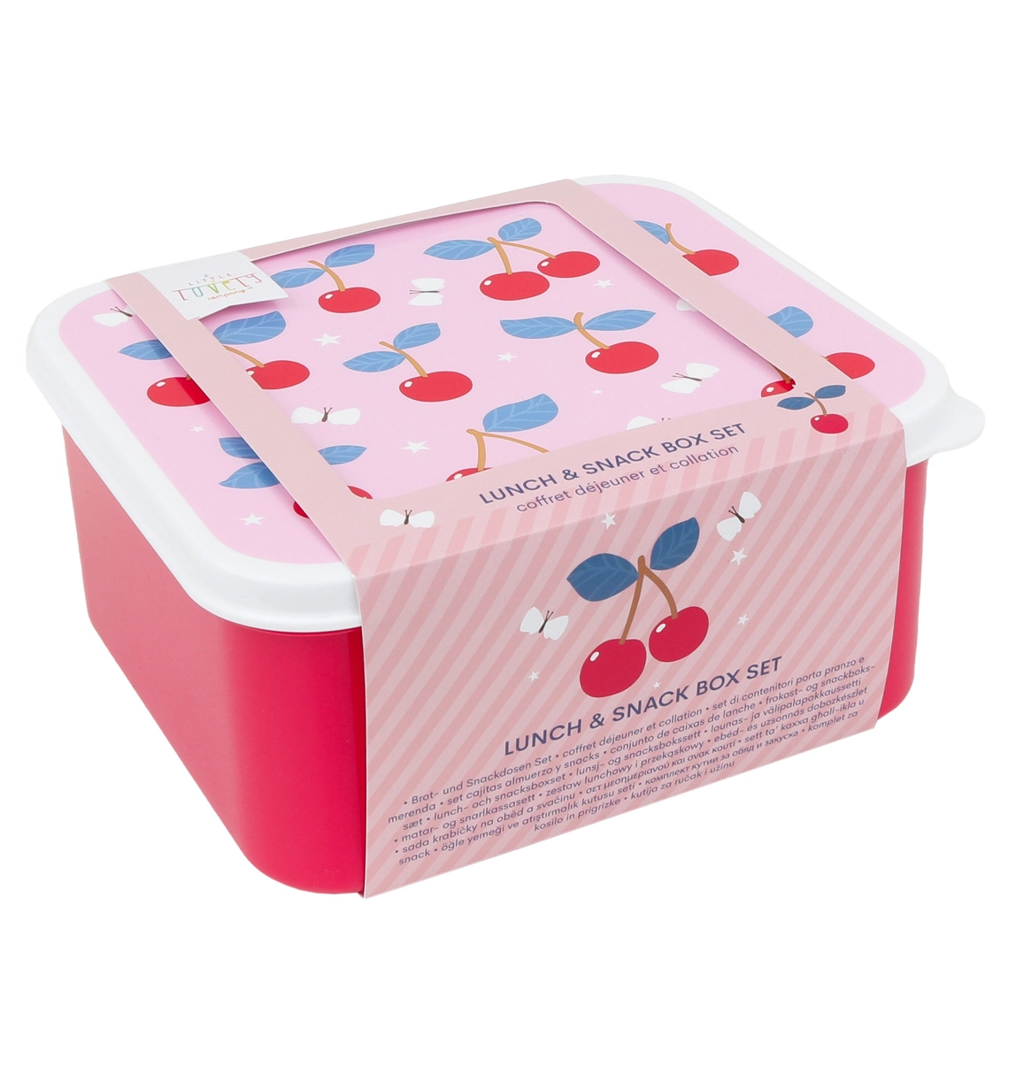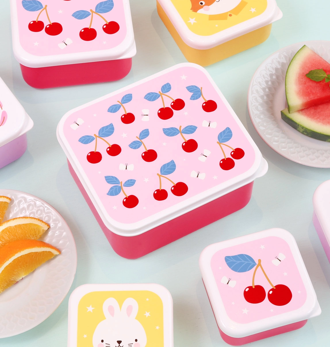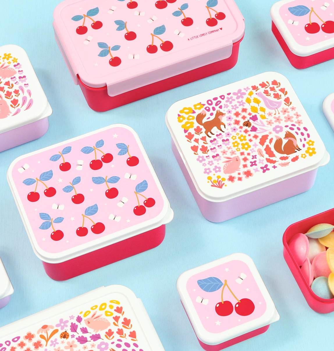 This set of snack boxes is ideal for everyday use thanks to its four different sizes, which can be stacked into each other for practical storage. The cherry design gives your meals and snacks a fun and friendly look. Please note that these boxes are not dishwasher safe nor microwave safe. Wash all containers in warm soapy water before first use.