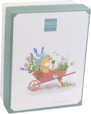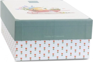 The cow is dressed in a green corduroy outfit with a floral collar, inviting play and providing relief and comfort. It is packaged in an elegant gift box suitable for storing memories such as photos and other baby birth mementos. The gift box also includes two short stories for delight.