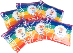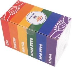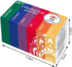 The package includes six bold shades: white, orange, yellow, green, blue, and purple. The set is a great choice for the Holi festival, themed parties, teambuilding, and promotional events. The powder is washable and easy to remove from most fabrics.