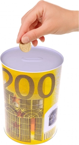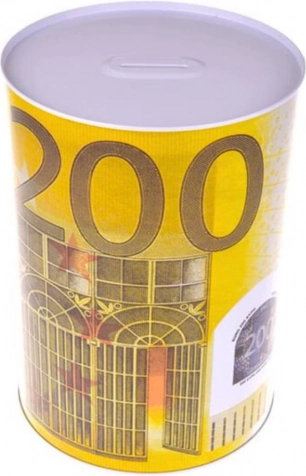 This efficient metal piggy bank, shaped like a can, is printed with a 200 euro banknote. Perfect for anyone looking to save with pleasure and style. Thanks to the realistic graphics with striking details and robust cylindrical construction, it serves not only a practical function but an aesthetic one, too – it can be a decorative element on a desk, shelf, or dresser. Made from durable metal, it guarantees resistance to everyday use, light impacts, and mechanical damage, contributing to its long longevity.