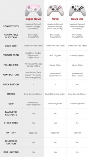 The GameSir Super Nova combines cutting-edge tech with elegant design. Magnetic Hall Effect sticks rated for up to 5 million cycles and precise Hall triggers with stops ensure smooth, drift-free input and instant response. Three connection modes (Bluetooth, 2.4G wireless via dongle, USB‑C cable) and a 1000 Hz polling rate provide a competitive edge in any game.