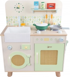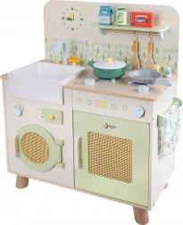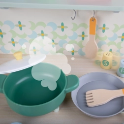 This wooden kitchen is designed for children aged 3 years and up and offers great aesthetic details in pastel colors. Develops imagination, motor skills, and social skills in children. It is made with high quality and attention to every detail. The package also includes kitchen accessories that children can use for pretend cooking and other everyday situations.
