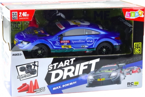 RC racing car for drift 30 km/h, blue with LED and interchangeable tires, 1:16 scale. Ideal for young motor enthusiasts.