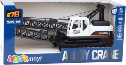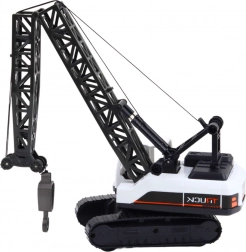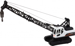 The crane has a movable arm with a hook that can be raised and lowered. The crane arm moves on joints and the rotating base allows a full 360° turn. The entire construction is built on a solid track chassis, which increases realism and stability. The toy is designed in a white-black color scheme with details that mimic professional construction equipment.