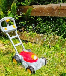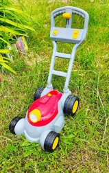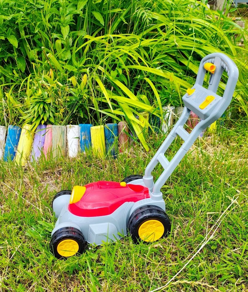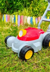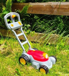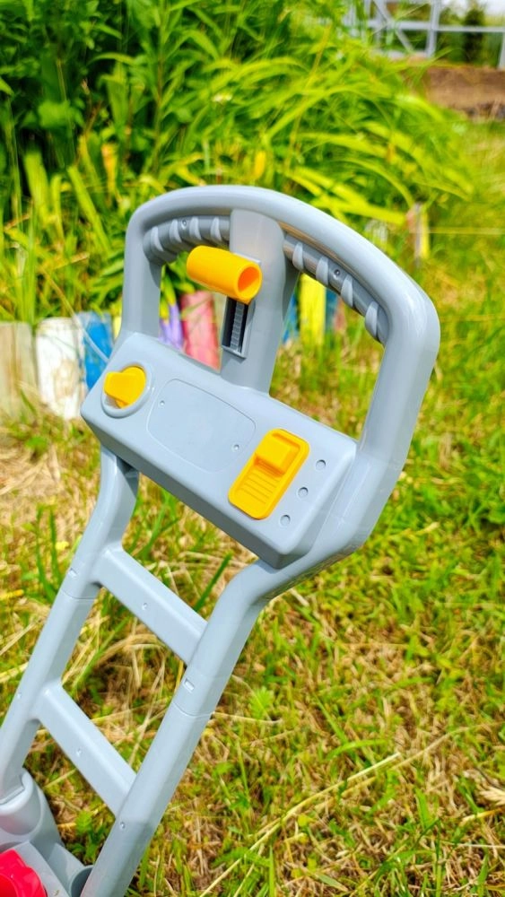 A sturdy plastic handle and large wheels make it easy to push around the garden. The lightweight design is ideal for small hands.