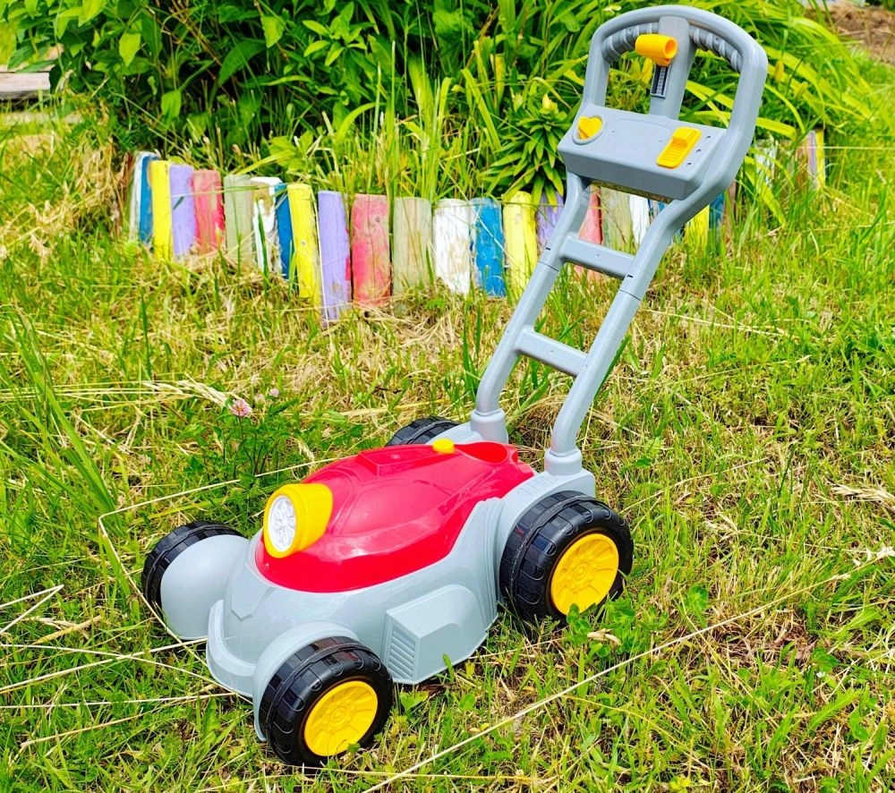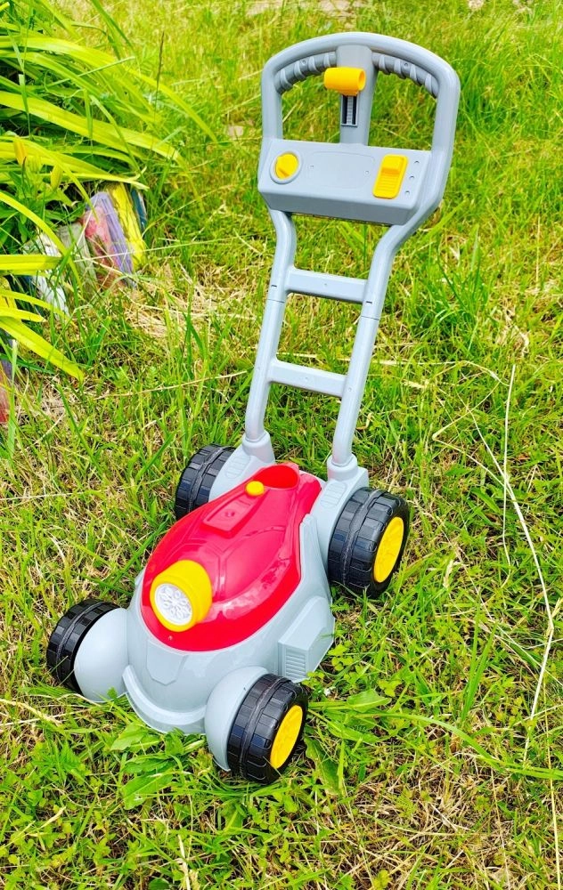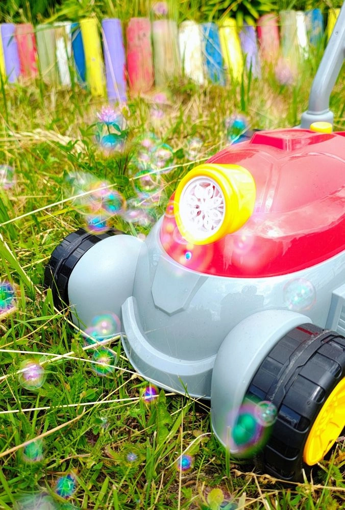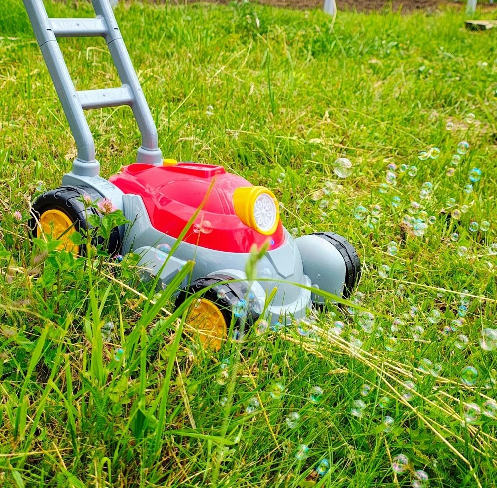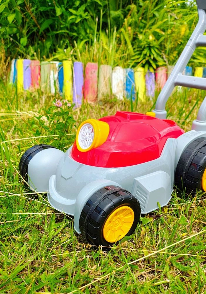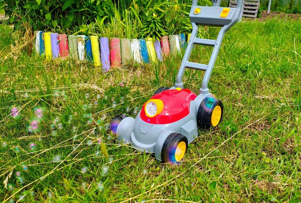 This kids’ bubble lawn mower offers two play modes: the first provides continuous bubble blowing, the second adds lights and music for even more fun. Simply screw the included solution into the bottom, press the button, and watch the front “engine” turn into a bubble show.