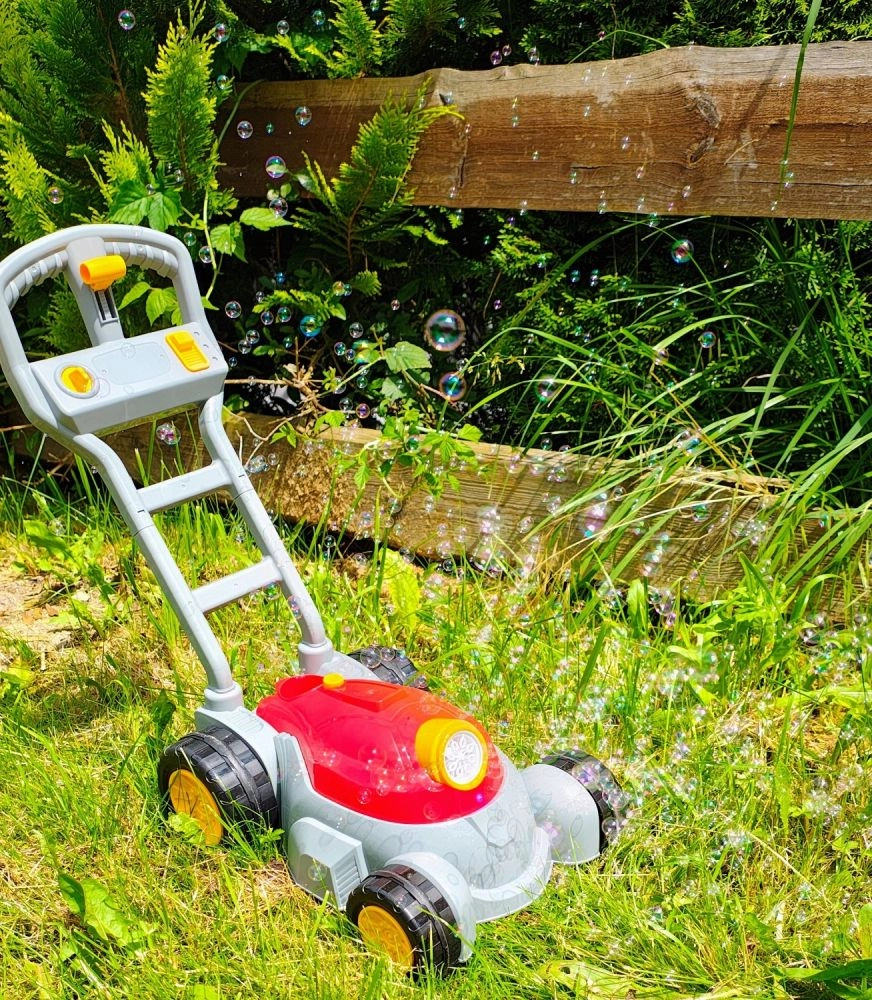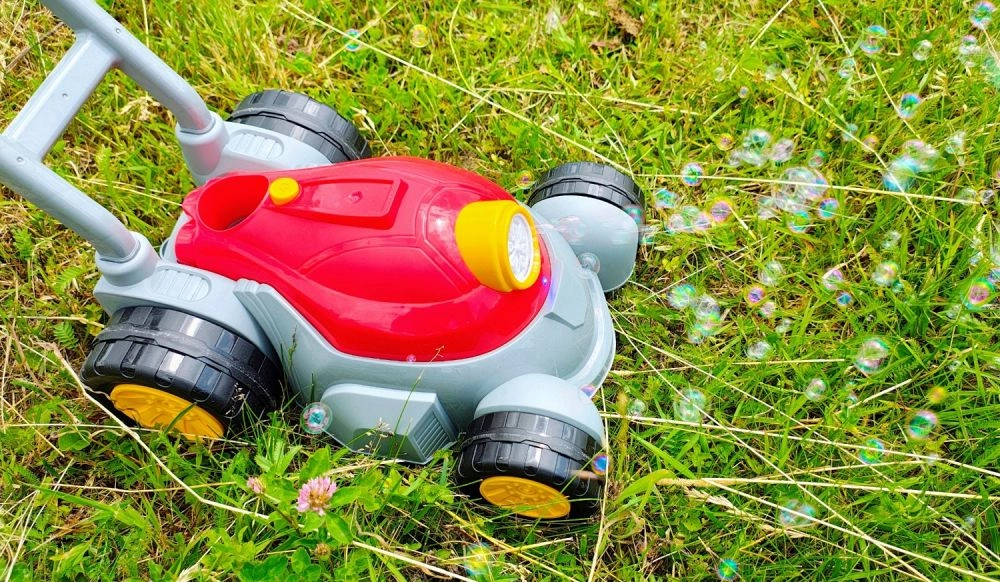 The built-in bubble maker produces lots of bubbles from the front of the mower. The solution is included in the box – you can start right away.