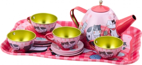 Metal Tea Set for Children with Cat Motif, Pink, 15 pcs