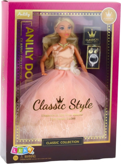 Anlily Doll in Powder Evening Dress is an elegant toy that will enchant any little fan of style and fairy tales. The dress in a soft pink shade is adorned with lace and tulle, making it an exceptional piece.