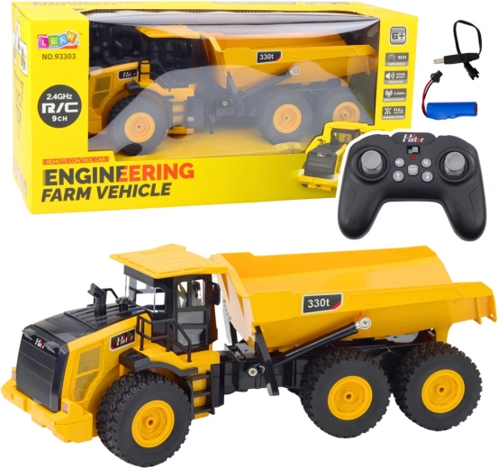 The remote-controlled truck in yellow color with model designation 330t is a perfect toy for your little construction machine enthusiasts. With large wheels, a tilting system, and quality construction, it provides a realistic experience and allows for seamless control thanks to 2.4 GHz technology.