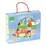 Discover high-quality VILAC wooden puzzles with household themes, ideal for little ones from 2 years. The set includes 4 separate 6-piece puzzles in a practical wooden box with a cotton handle. A great choice for developing fine motor skills, logic, and concentration in children.