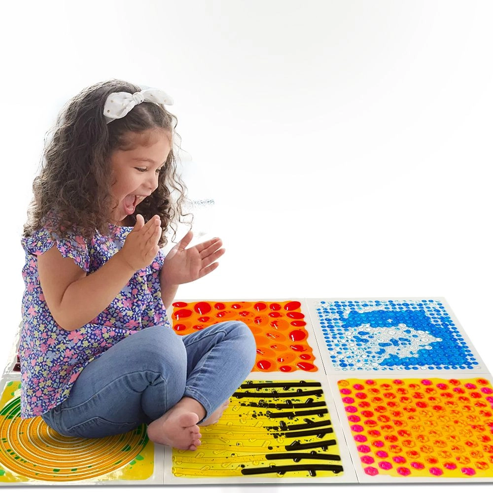 Set of six square liquid mats measuring 30x30 cm filled with a non-toxic mixture of water and oil in vibrant colors. Ideal for children from 3 years old with a load capacity of up to 120 kg.