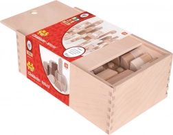 The building set is made of durable wood with a smooth surface for safe play. The practical wooden box with a sliding lid makes storage and keeping the kids’ room tidy easy.