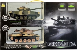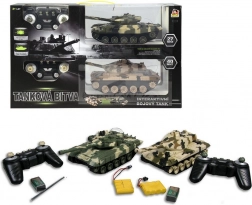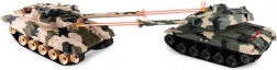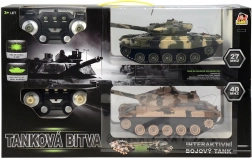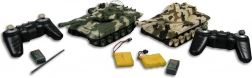 This tank set offers rich interactive fun with realistic combat features. A frequency of 27/40 MHz ensures reliable control up to a distance of 15 m. Each tank is equipped with cannon barrels with infrared diodes for hit detection. The controllers have a trigger to ensure a real combat experience. When a tank is hit, an explosion sound is heard, and the diodes on the tank turret count down “lives.”