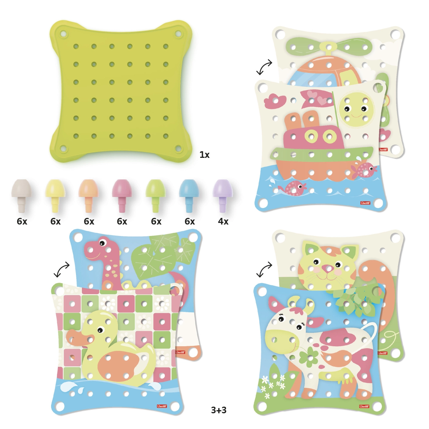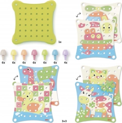 Discover the world of colors and shapes with the mosaic *Jumbo Peggy Evo*. Specially designed for children from the age of 2, this toy develops their *creativity* and *manual skills*. Children can not only insert the pegs into illustrated perforated cards but also build *tall towers* with them, which enhances their building abilities.
